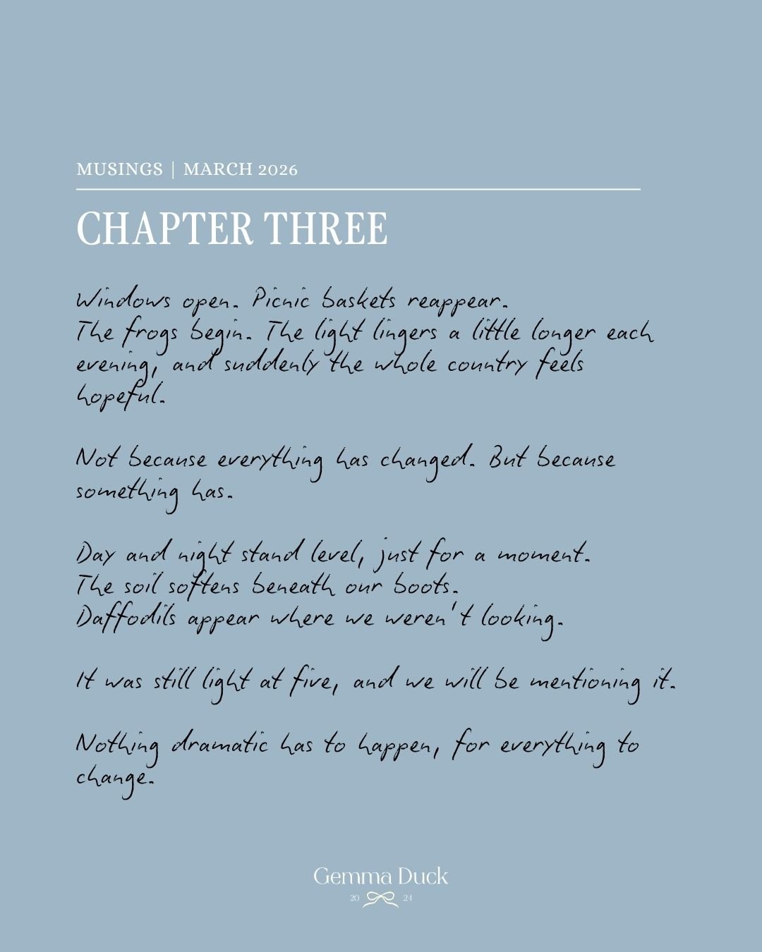 March is mud and daffodils. Frost and blossom. Windburn and wild optimism. It is not tidy. It is alive.